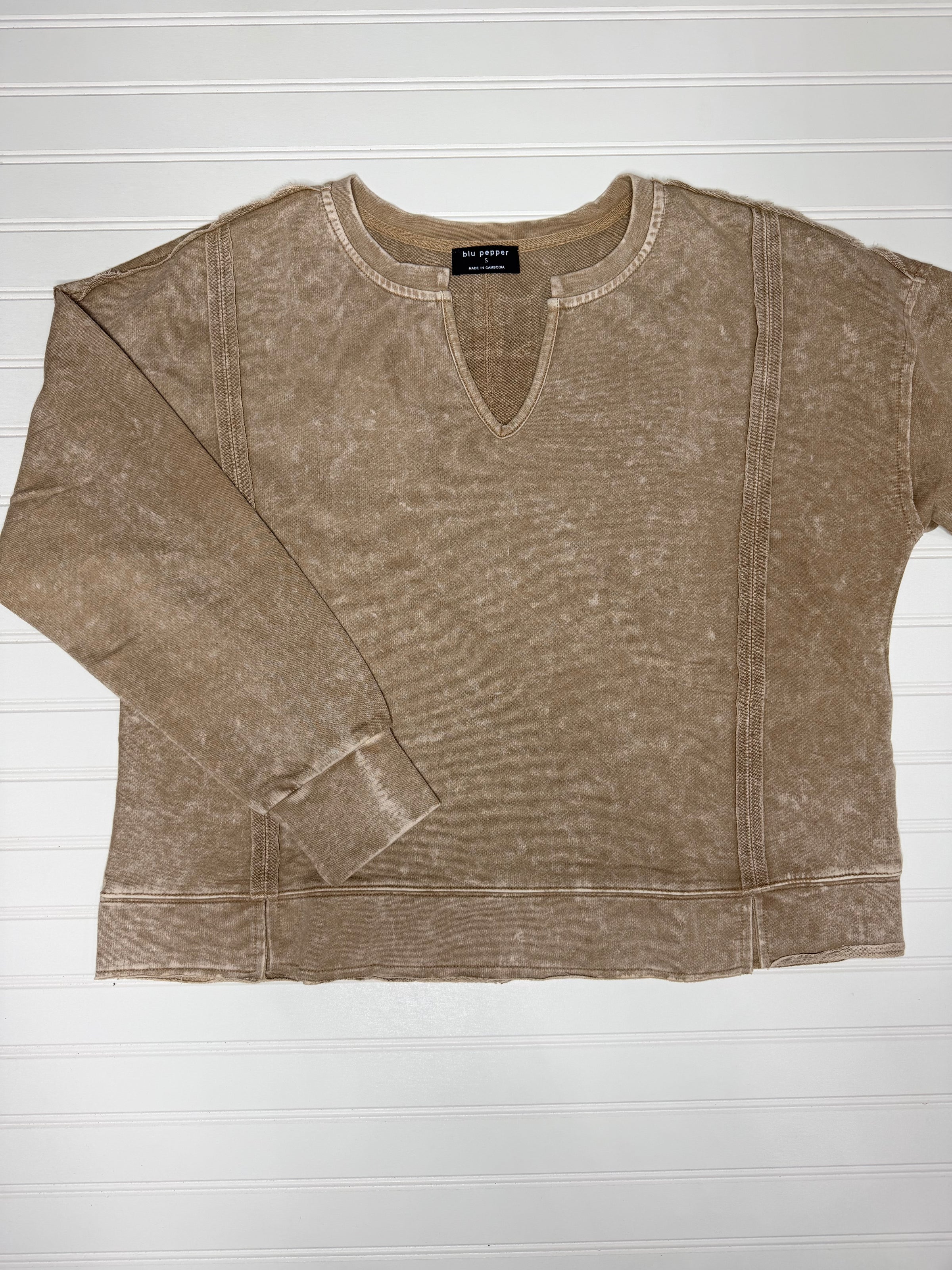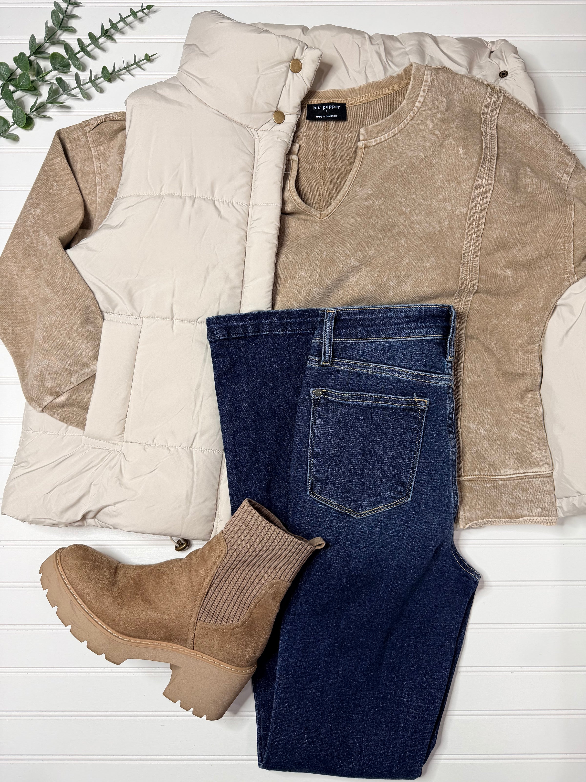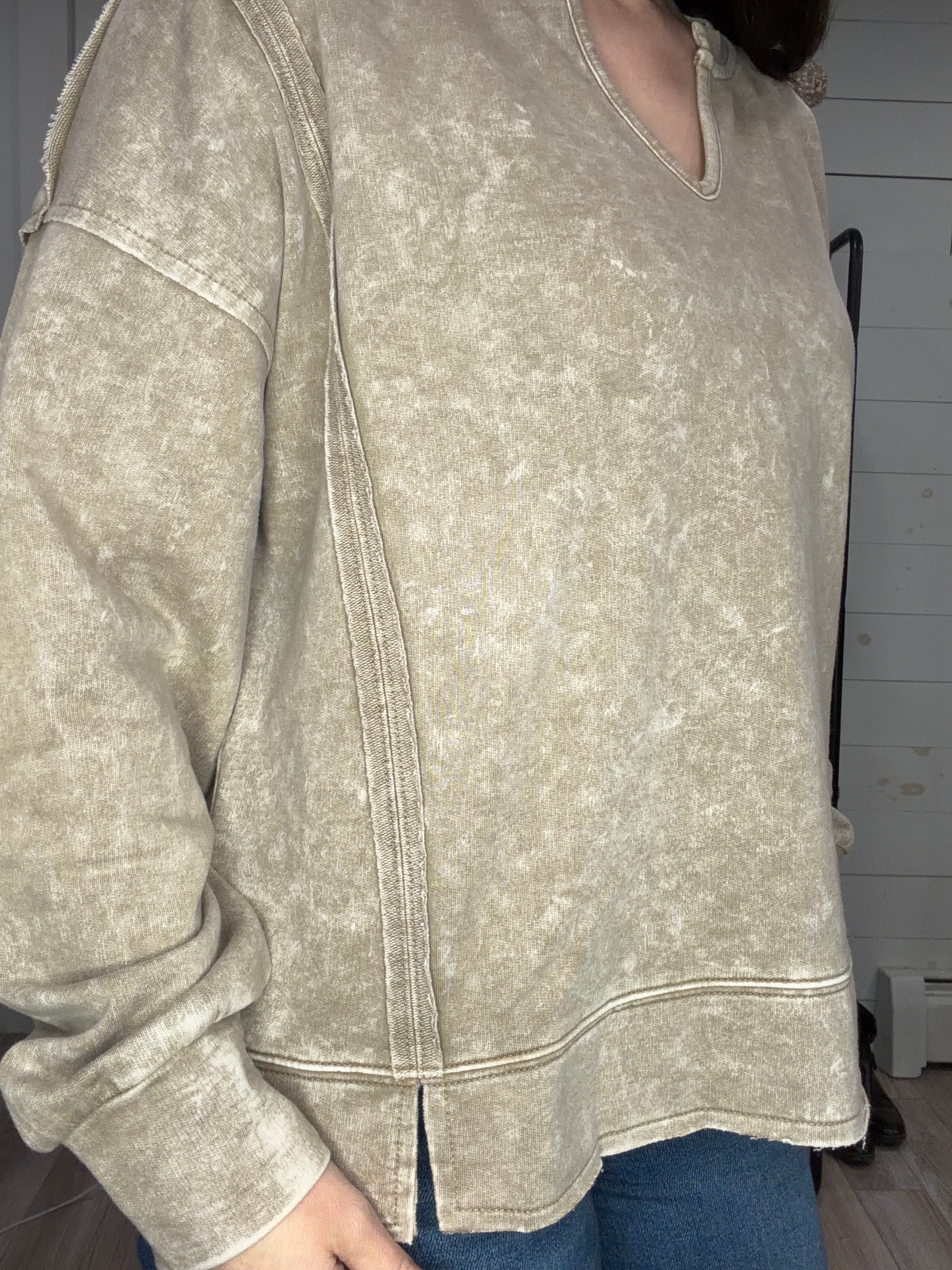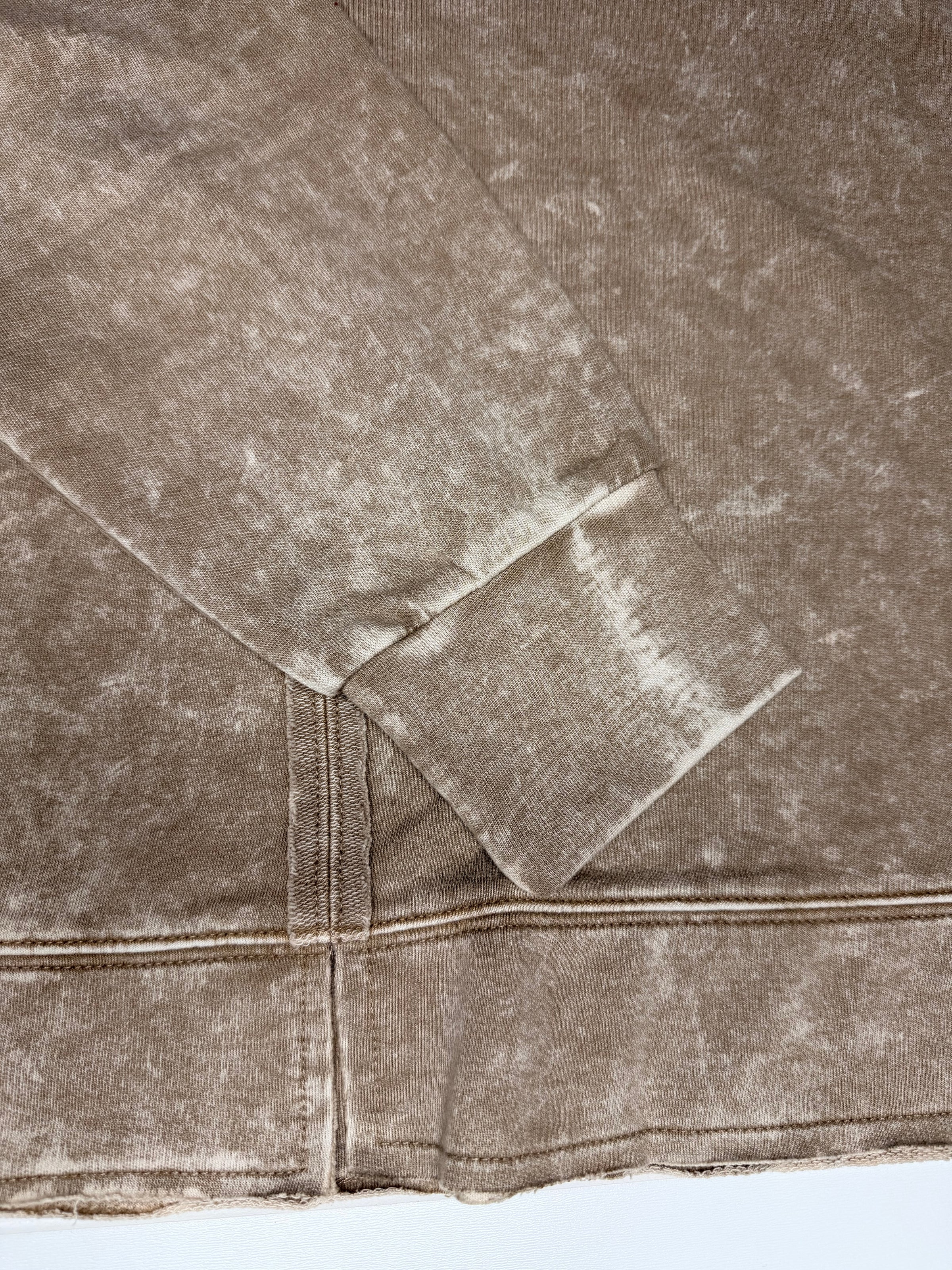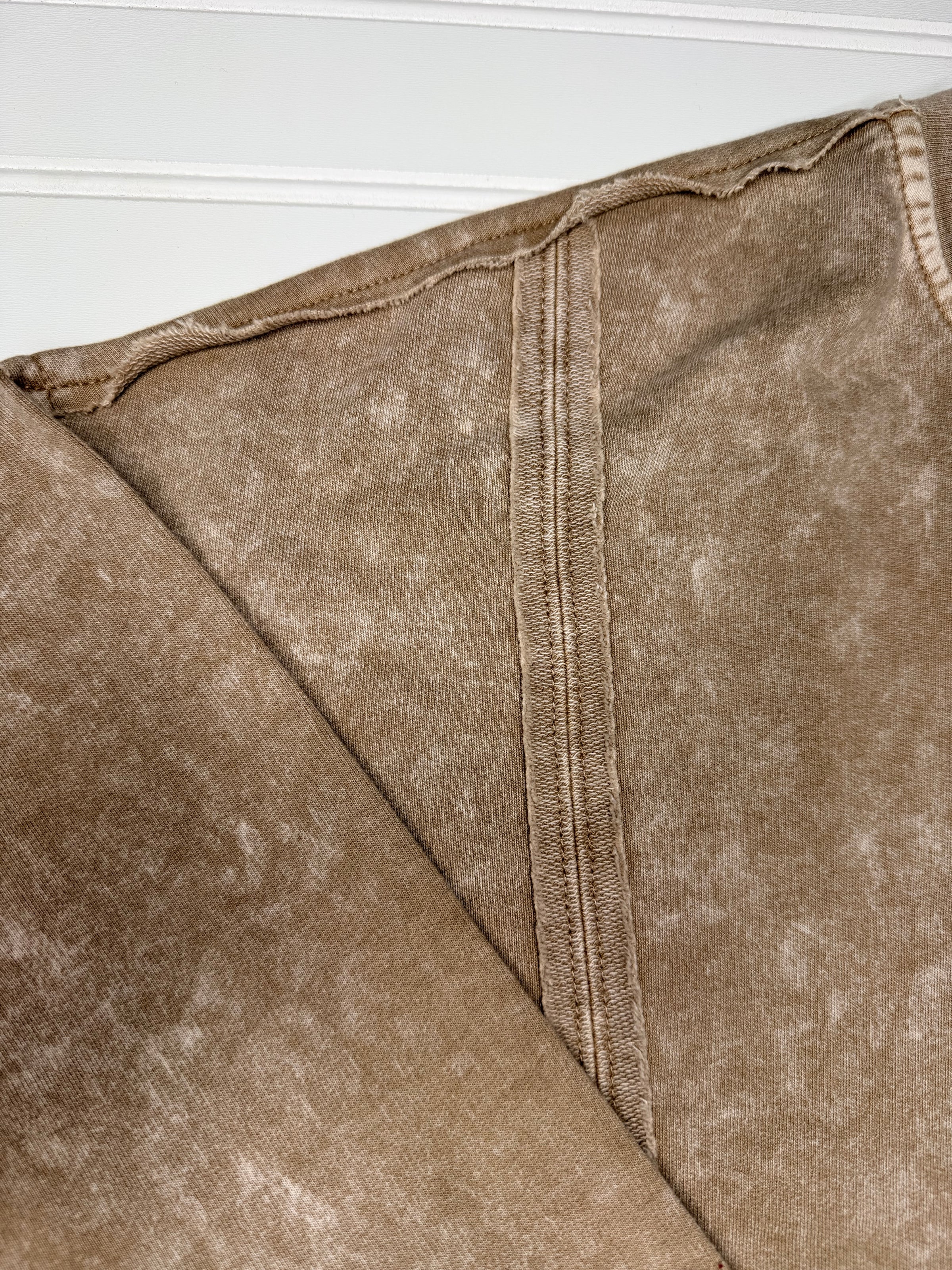 Cozy up in this playful Peppermint Mocha Long Sleeve, featuring a trendy split neckline that adds just the right amount of edge. The acid wash finish gives it that perfectly worn-in vibe, while exposed seams amp up the cool-girl aesthetic. Long sleeves keep you warm and comfortable, making this the ideal piece for layering or wearing solo. Perfect for coffee runs, casual hangouts, or whenever you want to look effortlessly put-together with a hint of attitude.