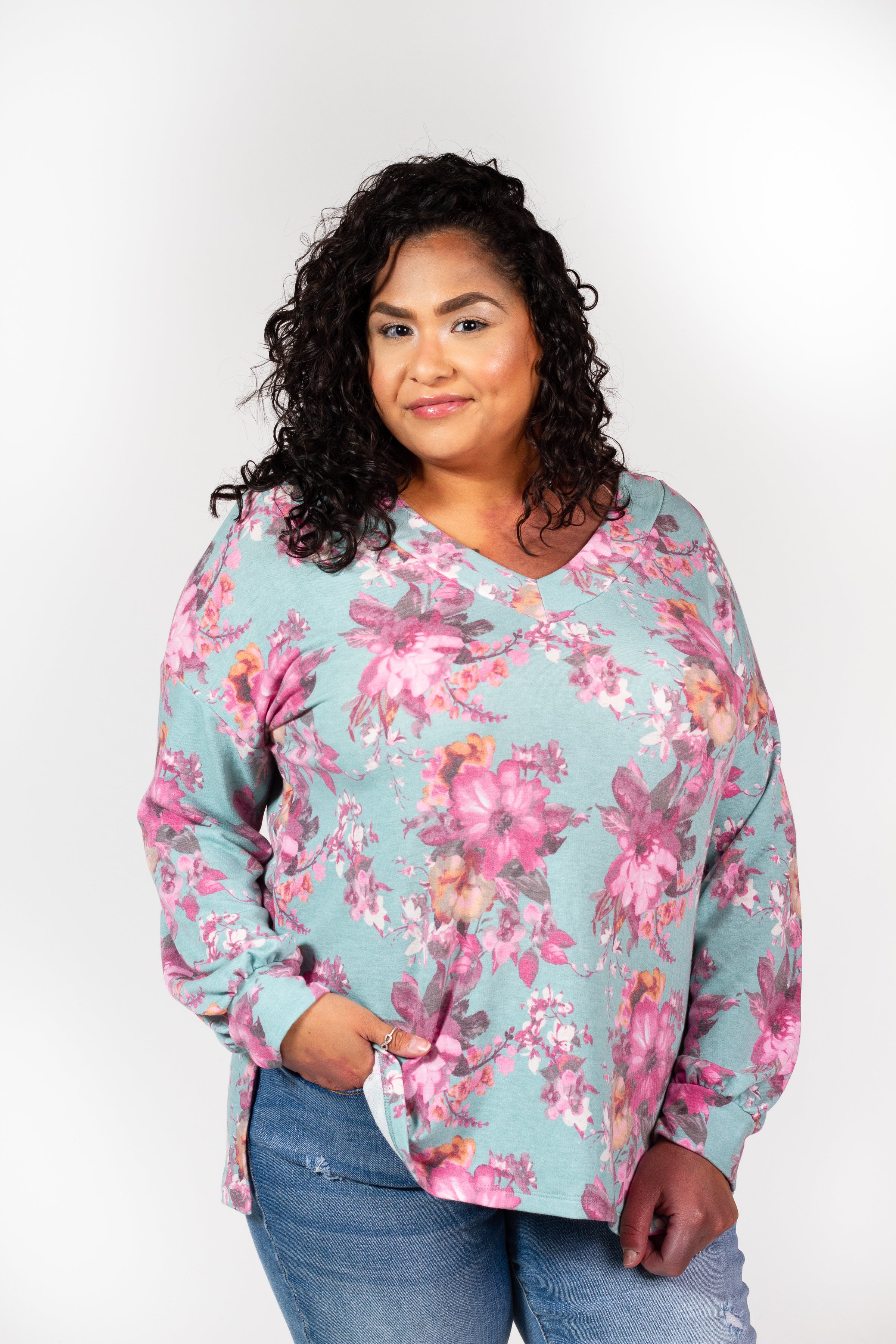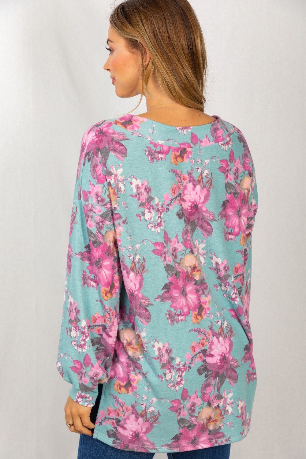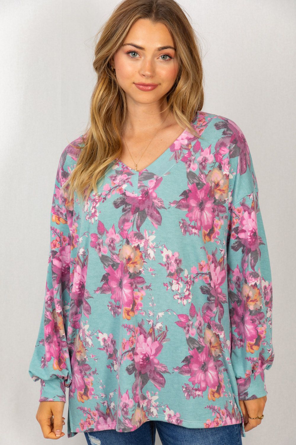 A long sleeve floral print knit top with a v-neck featuring bishop sleeves and side slits. Fabric is a lightweight french terry knit. So soft, cozy and perfect with denim or leggings!