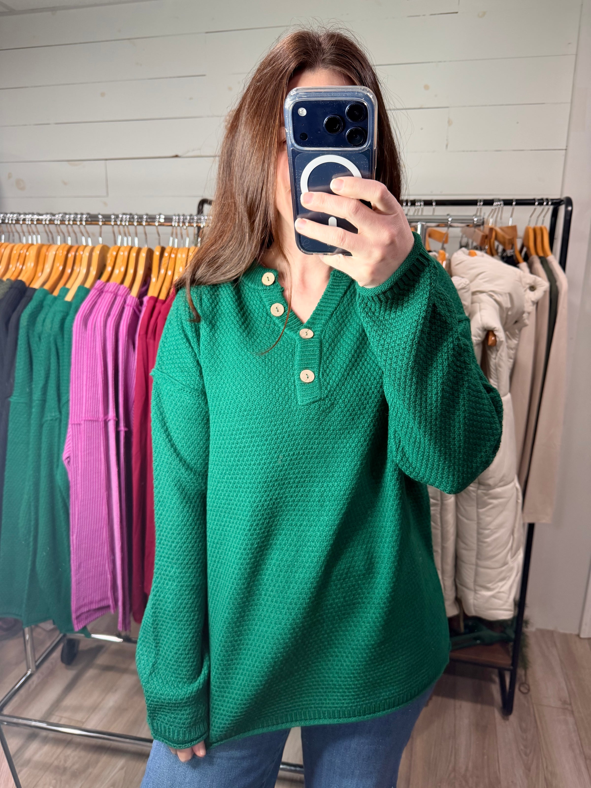 Slip into effortless style with this charming henley sweater, where comfort meets casual sophistication. Featuring relaxed dolman sleeves that drape beautifully and a classic button closure at the neckline, this piece layers like a dream. The rich green hue works with everything in your wardrobe, while the long sleeves keep you cozy through cooler months. Perfect for weekend adventures or lazy afternoons at home—it's the sweater you'll reach for again and again.