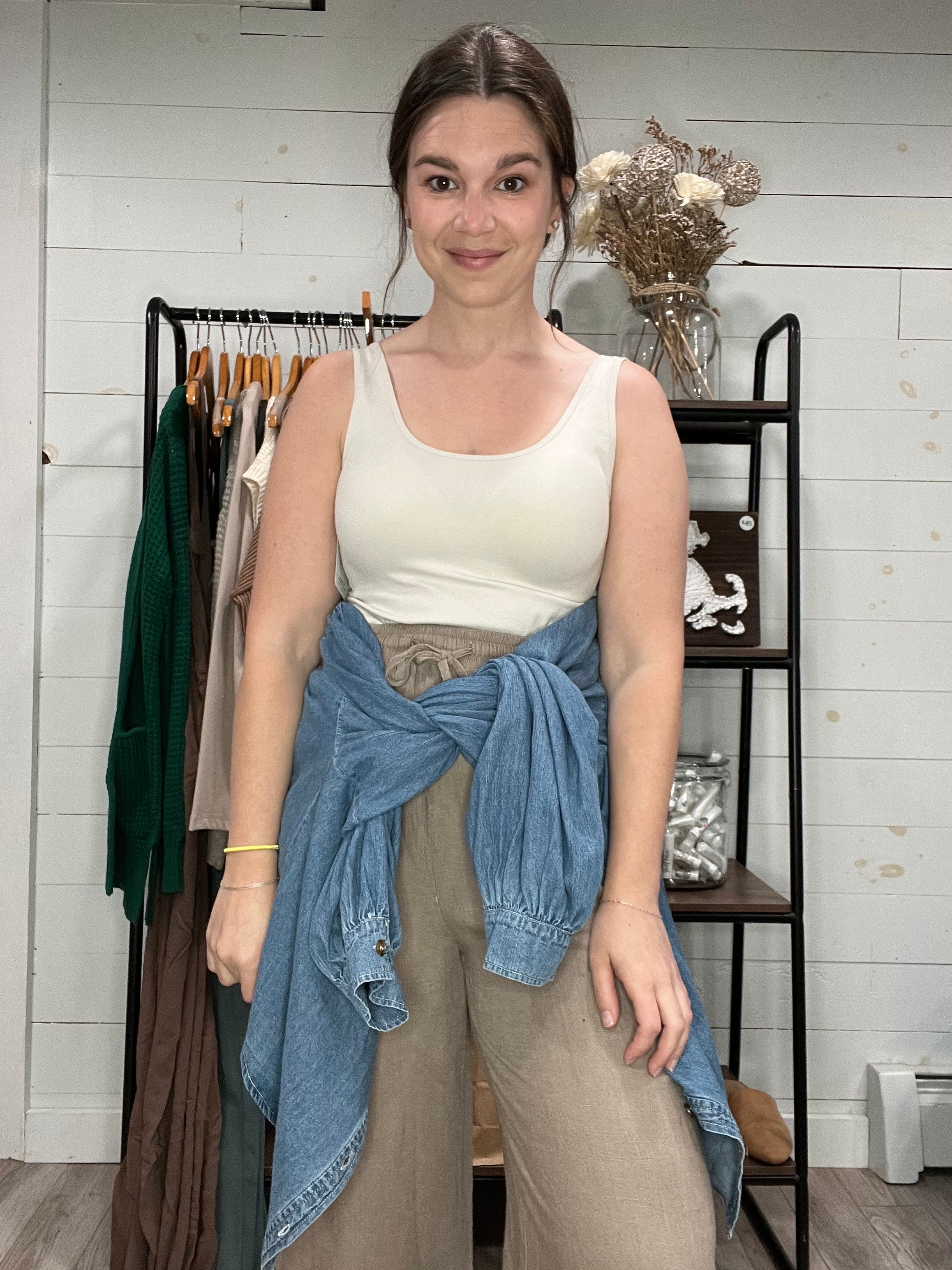 Get double the style with our 2 Way Layering Tank Top in beige! This tank top features a reversible design, allowing you to switch between a classic u-neck or trendy v-neck look. Fitted for layering, this tank is the perfect addition to any outfit. Stay stylish and versatile with this must-have top.