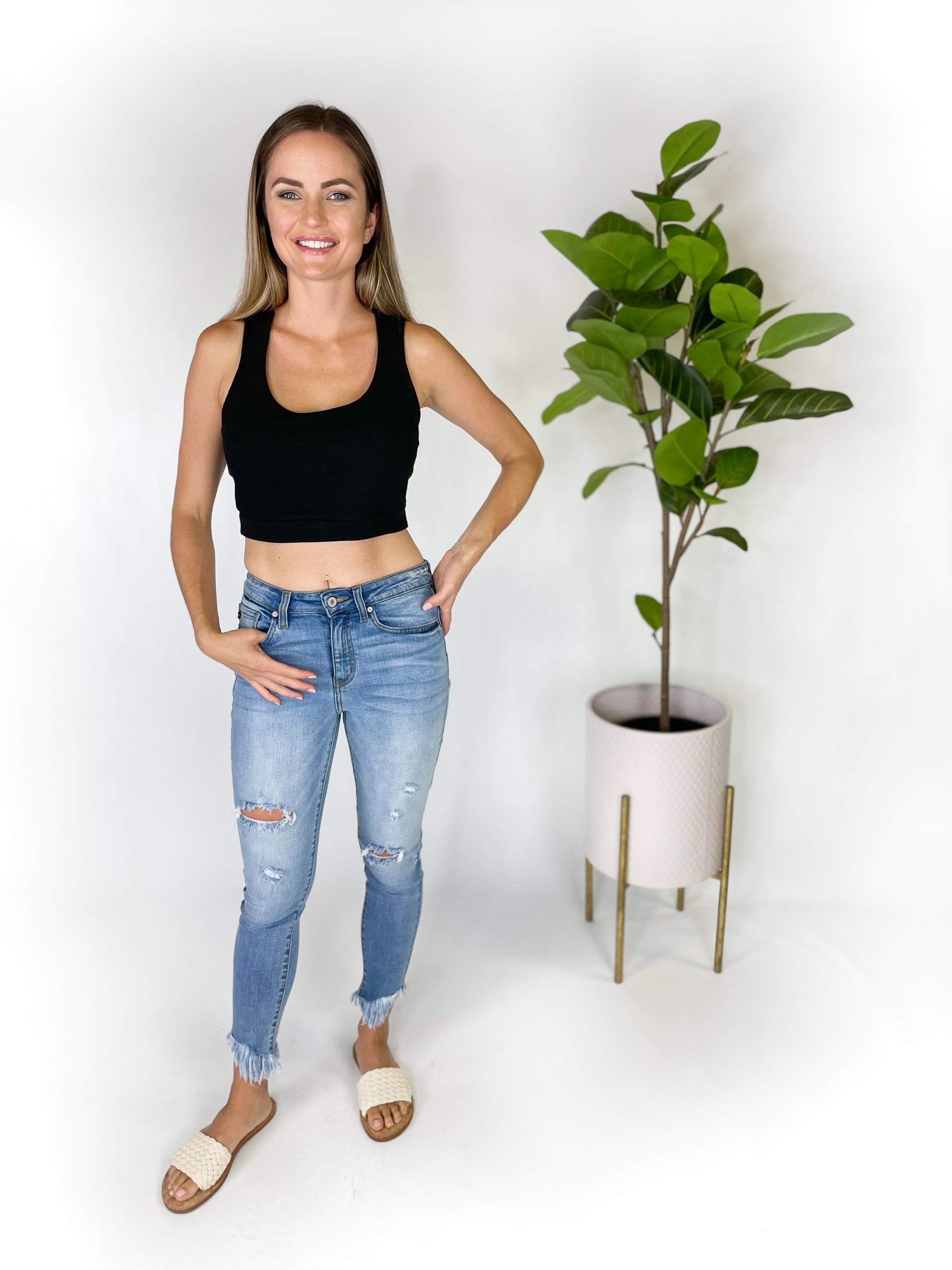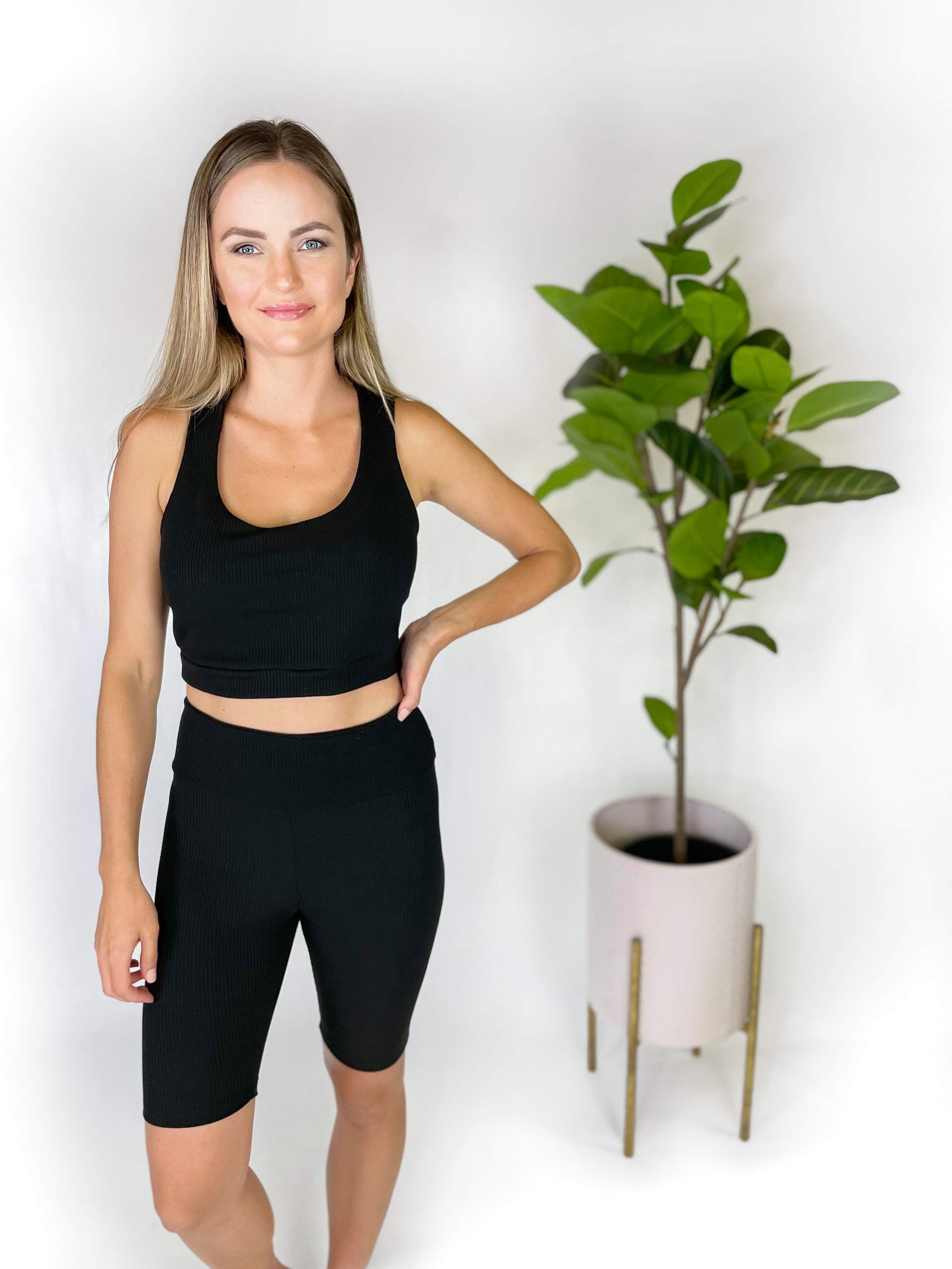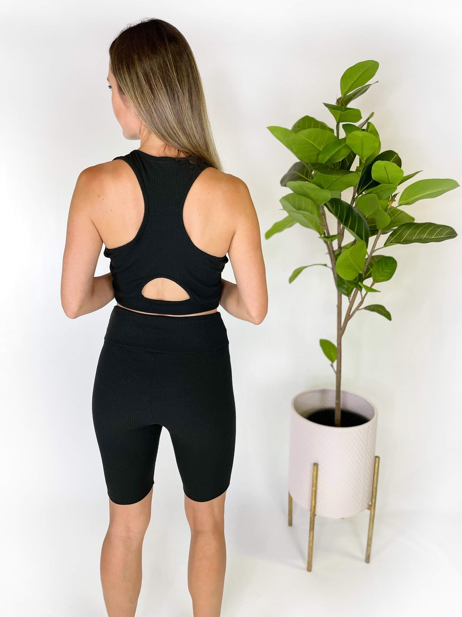 A sleeveless solid knit crop top with a scoop neck featuring a back cut-out and a matching wide yoga waistband biker short. Fabric is a lightweight ribbed knit.