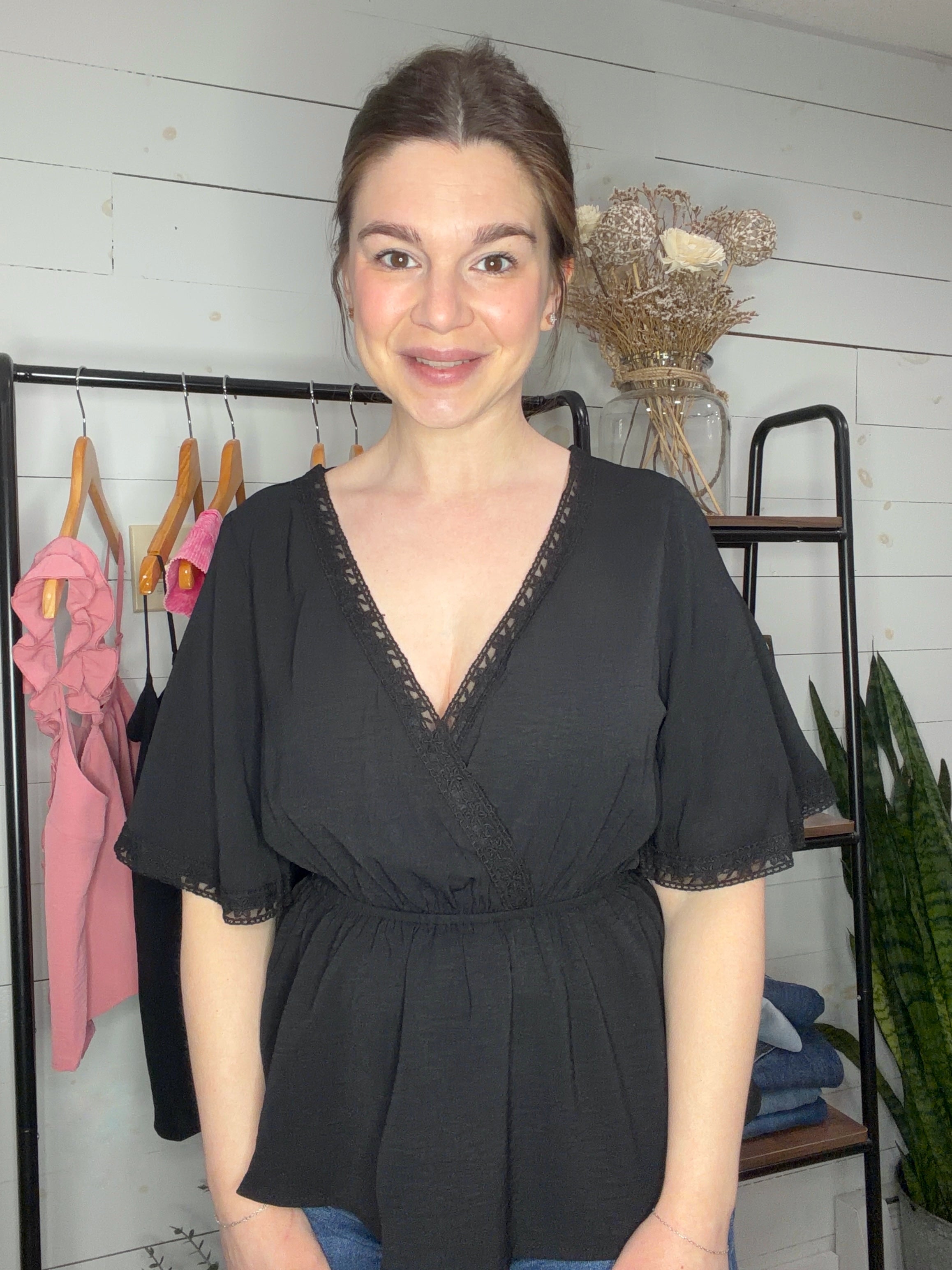 Get ready to turn heads in this playful lace peplum top! Intricate lace detailing brings an elegant edge to your wardrobe, while the peplum silhouette adds a fun, flirty flair that flatters every figure. The v-neckline and short sleeves strike the perfect balance between timeless and trendy, making it your go-to piece for any occasion. Whether you're heading to brunch or a night out, this versatile top proves that classic never goes out of style.