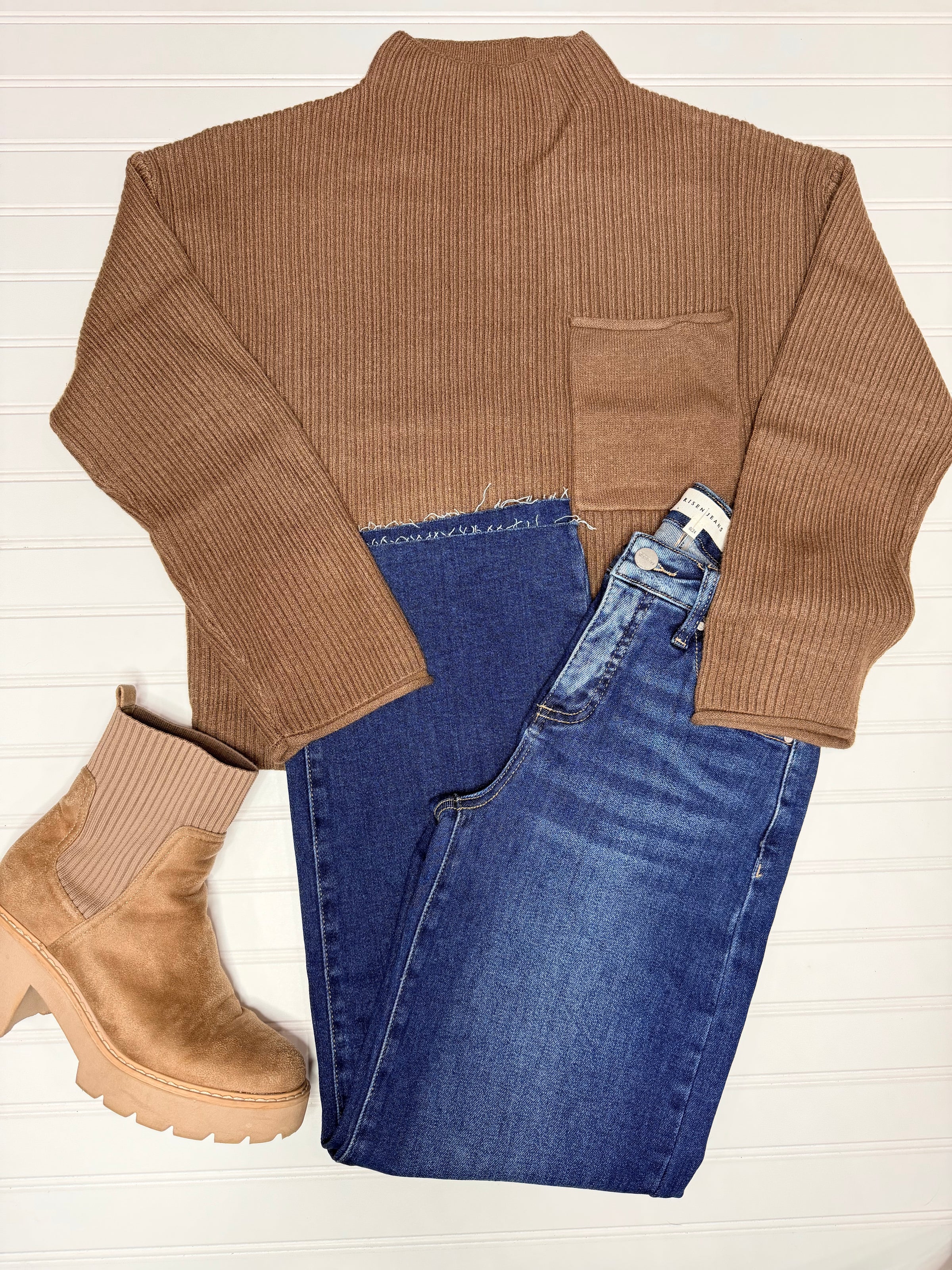 Wrap yourself in cozy comfort with this charming Hot Cocoa Sweater. Featuring a relaxed drop shoulder silhouette and soft ribbed knit fabric, it's the perfect layering piece for crisp autumn days. The mock neck adds a touch of sophistication, while a practical pocket detail keeps your essentials within reach. Whether you're sipping warm drinks by the fire or running errands around town, this sweater delivers effortless style with maximum snuggle factor.