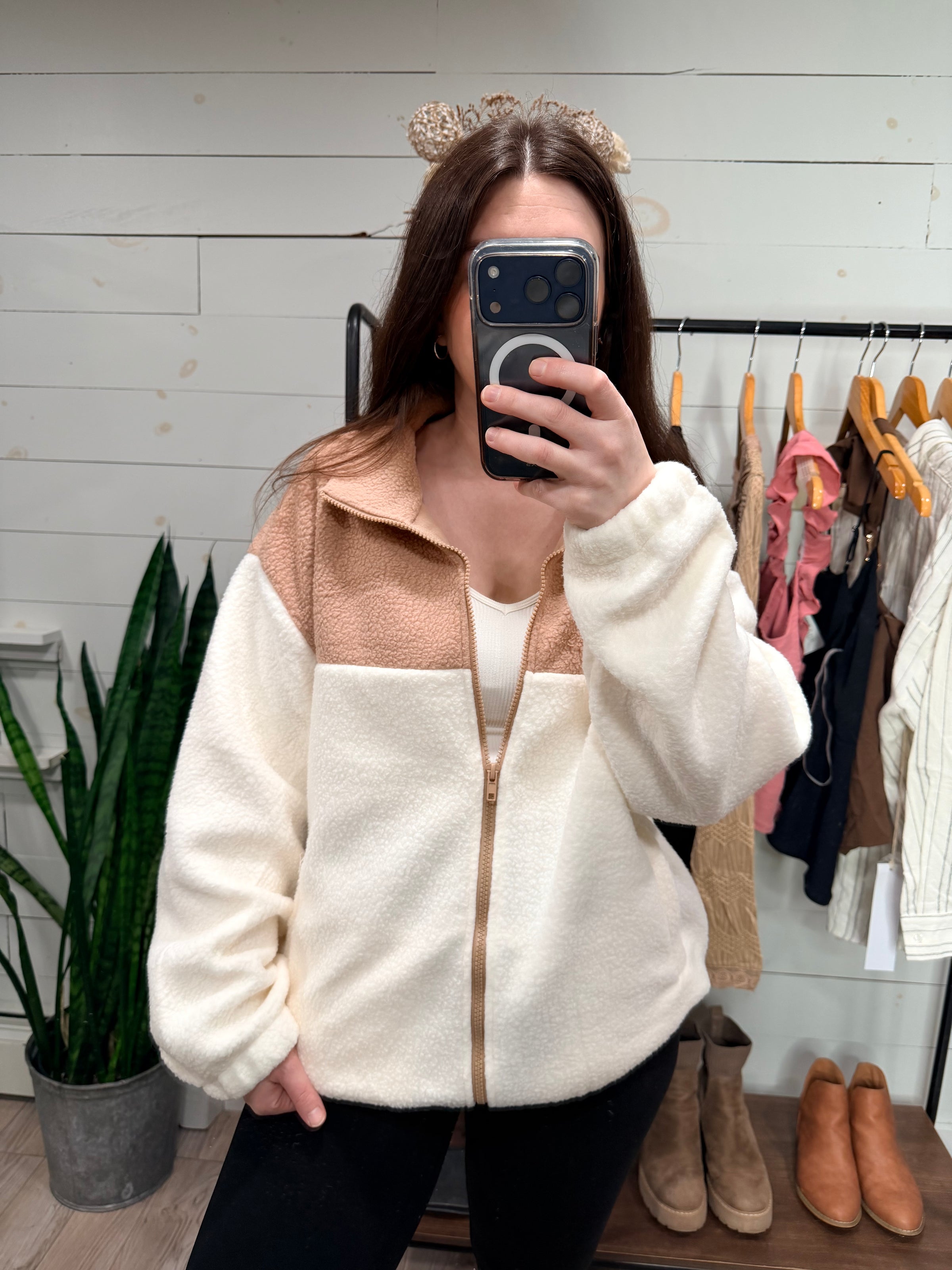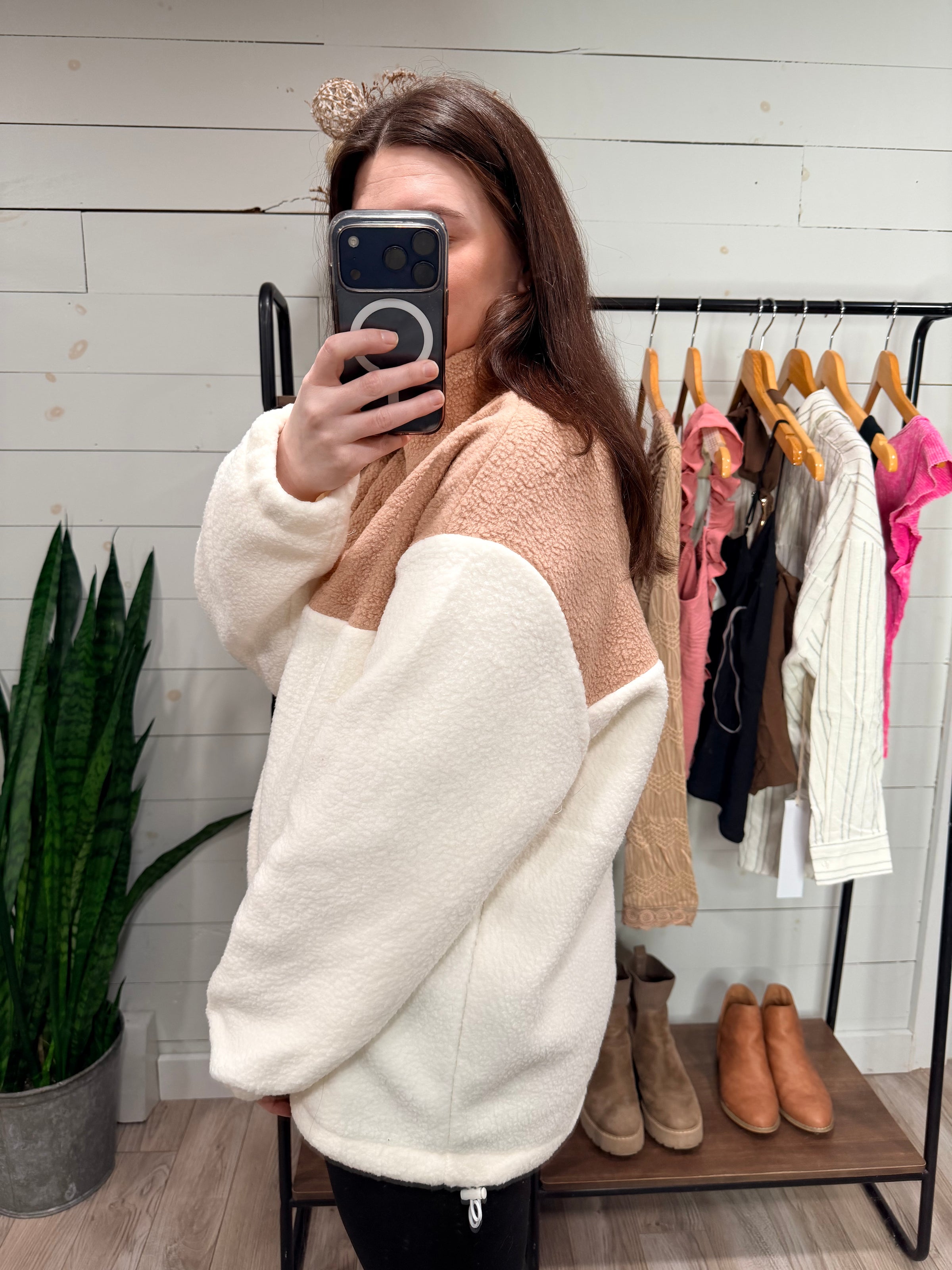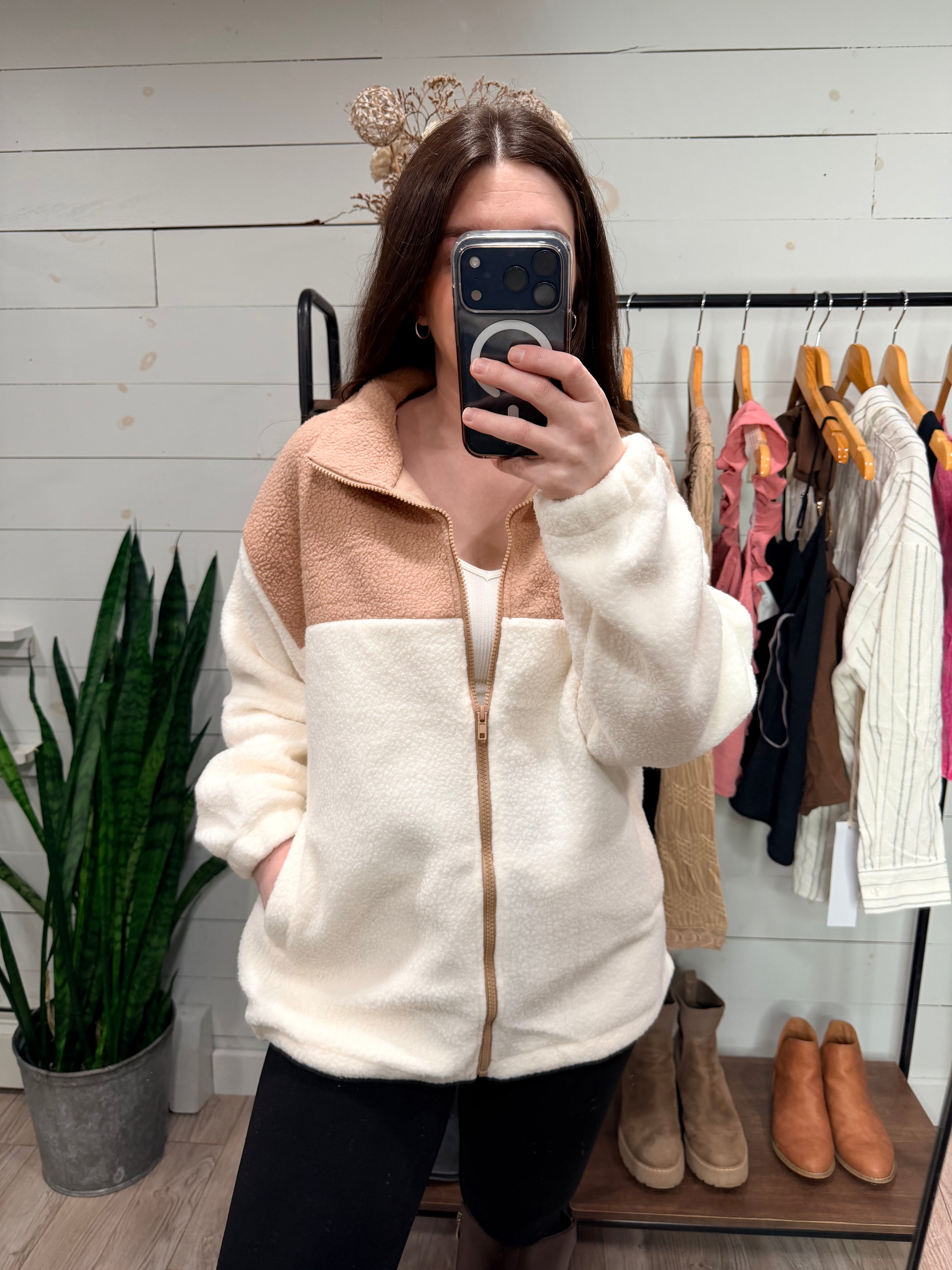 Wrap yourself in cozy comfort with this sherpa drawstring jacket that's equal parts snug and stylish. Featuring a plush taupe and cream color combo, it's the perfect layer for those "I can't decide what to wear" mornings. The drawstring bottom lets you cinch it just right, while the full zip makes it easy to slip on and off. Whether you're lounging at home or running errands, this sherpa essential keeps you feeling like you're hugging a cloud all day long.
